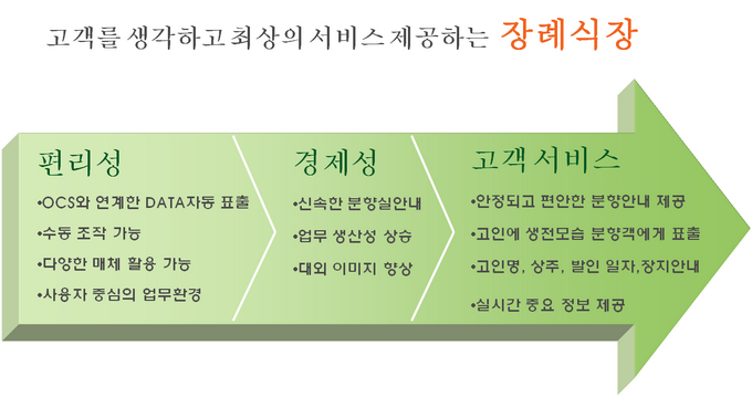 장례식장에 설치되는 첨단 COMPUTER와 PDP, LCD를 이용하여 고인명, 상주, 발인안내, 장지안내 등 정보를 제공하며, 장례식장 측에서는 신속하고 원활한 업무 및 편리한 업무 환경을 제공함으로서 장례식장 직원과 상주간의 조화로운 업무를 만들어 주는 효율적인 시스템 이다. 특히, 장례식장 이용안내 및 상주 측에서 고인에 생전 모습을 제공하면 동영상으로 표출하고 고인에 사진도 표출 할 수 있는 고 품격의 장례 서비스입니다.